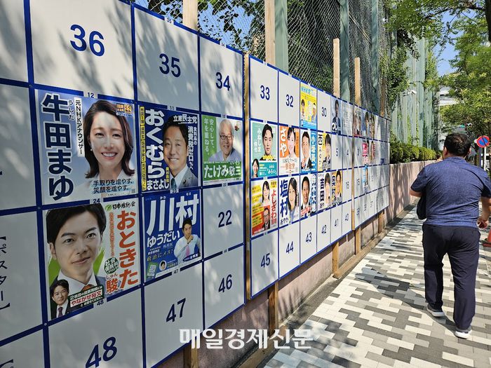20일 일본 참의원 선거가 치러지는 가운데 한 시민이 선거 벽보 앞을 지나가고 있다. [도쿄 이승훈 특파원] |