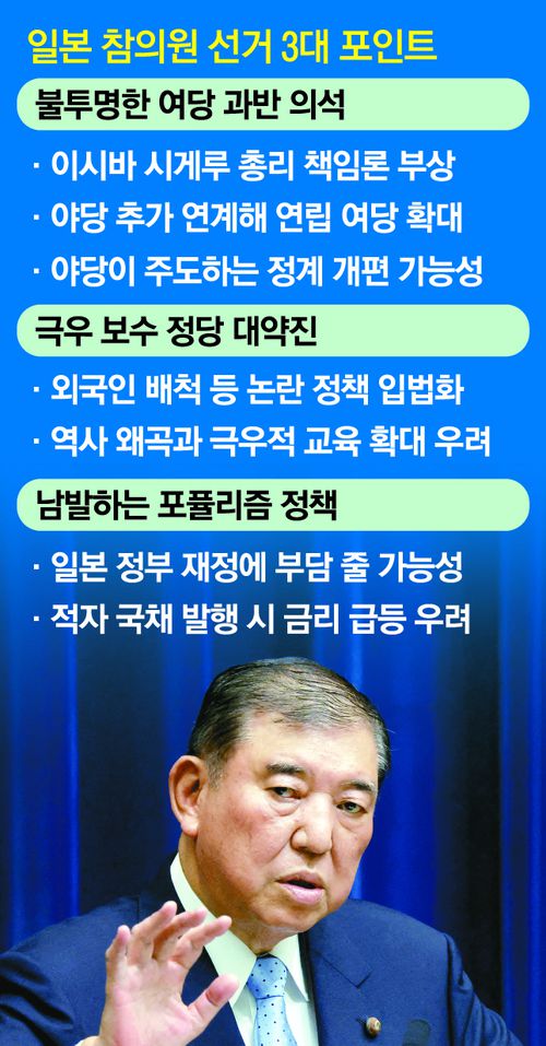 오는 20일 열리는 일본 참의원(상원) 선거가 중반전을 넘은 가운데 여야 모두 국민을 향한 표심 획득에 총력을 기울이고 있다. 현재 여론조사 결과 등을 보면 여당의 과반 의석 유지가 불투명해진 상황에서 극우 정당의 세력 확대와 잇단 대중영합주의(포퓰리즘) 공약 등으로 선거 후의 대혼란이 우려되는 분위기다.