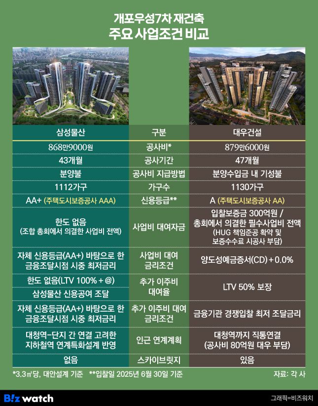 지난 2020년 이후 5년 만에 강남권 핵심 입지에서 맞대결을 펼치는 삼성물산 건설부문과 대우건설이 치열한 공방전을 펼치고 있다. 두 건설사는 서울 강남구 일원동 일대 '개포우성7차아파트 재건축정비사업'에 출사표를 던지고 한 발짝도 물러설 수 없다는 각오를 보이고 있다.