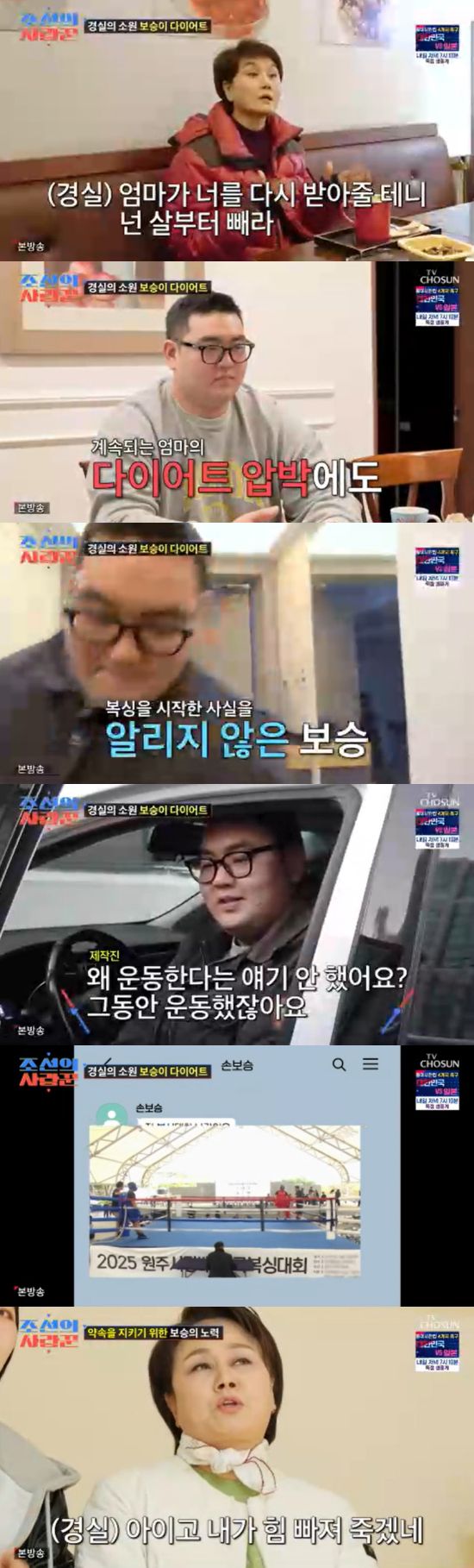 손보승은 이경실의 말대로 살을 빼기 위해 1년여 동안 꾸준히 복싱을 했다. 손보승은 "사실 작년 7월부터 복싱을 시작했다. 대리운전하기 전에 하고 끝나고 하고. 되게 열심히 꾸준히 계속 열심히 했다"라며 전했다.