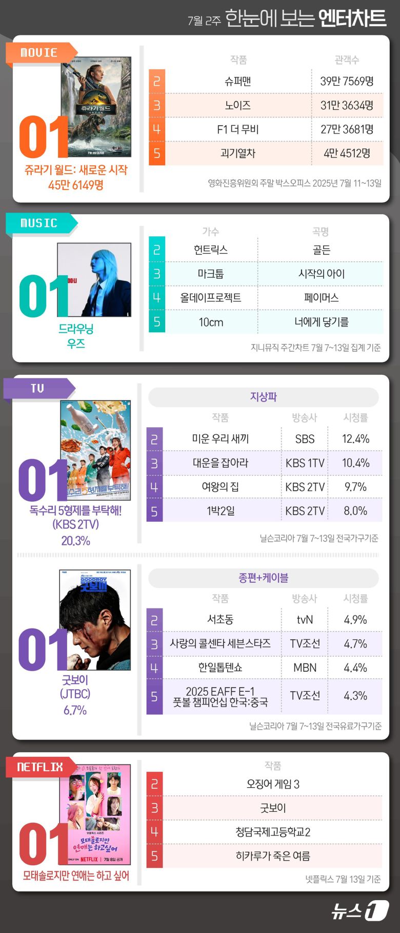 ◇ 지상파=KBS 2TV '독수리 5형제를 부탁해!' 1위(닐슨코리아 2025년 7월 7~13일 전국 가구 기준)