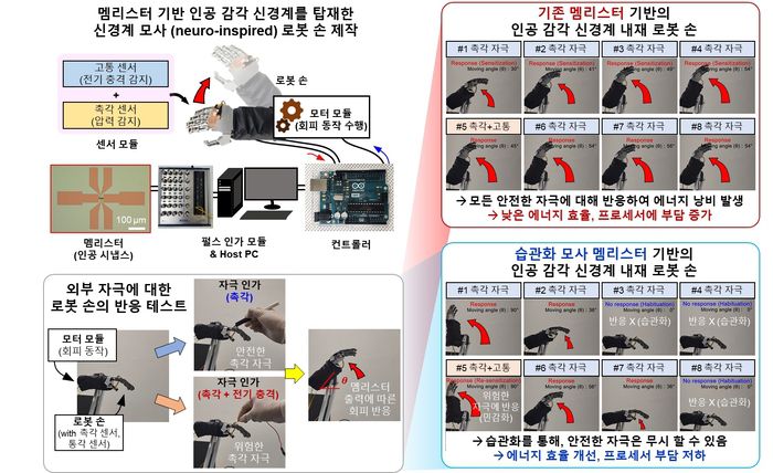 연구팀은 이 멤리스터로 촉각·고통을 인식하는 인공 감각 신경계를 제작하고, 실제 로봇 손에 적용해 습관화 및 민감화 특성을 확인됐다. 이로써 로봇이 사람처럼 효율적으로 자극에 대응하고, 에너지 측면에서 효율적인 신경계 모사 로봇 개발 가능성을 검증했다.