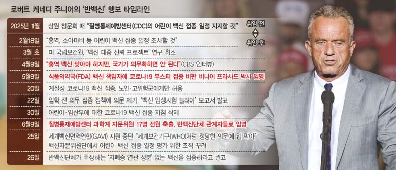 2000년 세계보건기구(WHO)로부터 ‘홍역퇴치국가’ 인증을 받았던 미국이 이렇게 전락한 데엔, 케네디 장관의 책임이 크다는 목소리가 나온다. 백신이 자폐증의 원인이라는 근거 없는 주장을 펼쳐온 그가 보건복지부 수장으로 임명됐을 때부터 반대가 거셌다. 청문회에서 그는 “내 자녀는 모두 백신을 맞았다”며 “어린이 백신 접종 일정을 지지할 것”이라며 ‘고비’를 넘겼으나, 취임 직후 말을 바꿨다.