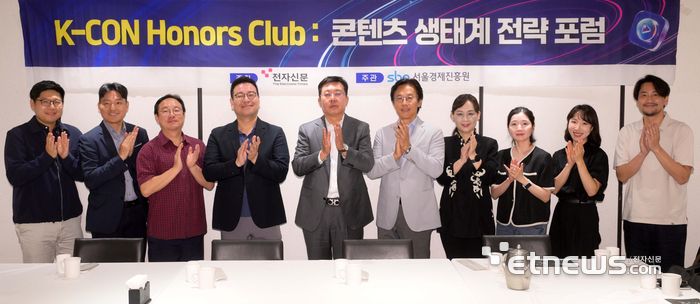 전자신문이 주최하고 서울경제진흥원이 주관한 'K-콘 아너스 클럽 : 콘텐츠 생태계 전략 포럼'이 15일 서울 중구 컨퍼런스하우스 달개비에서 열렸다. 김범진 CJENM 기업커뮤 팀장, 황재현 CGV 담당, 고기호 인넥스트트렌드 이사, 전대진 스토리위즈 대표, 강병준 전자신문 대표, 황경주 아티스트컴퍼니 대표, 김양미 와우온 대표, 오선민 앤드마크 실장, 김청 NHN 팀장, 이재문 히든시퀀스 대표.