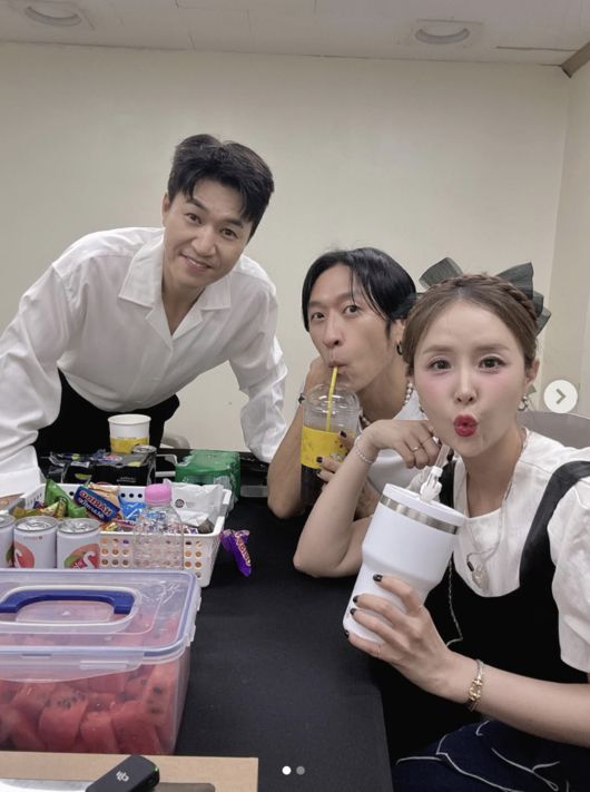 공개된 사진 속에서 신지는 코요태 멤버인 김종민, 빽가와 함께 활짝 미소지은 모습이다. 블랙앤화이트 패션으로 코디를 맞춘 멤버들은 카메라를 보며 웃음을 보이고 있다.