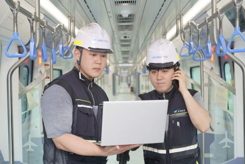 공항철도 직원들이 용유차량기지에서 5G 특화망에 연결된 노트북을 통해 객차 및 설비를 점검하고 있다. LG유플러스 제공 |
