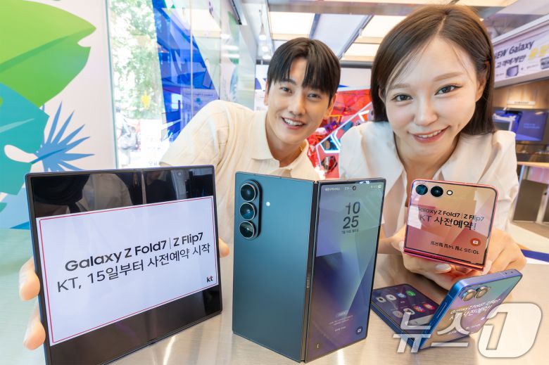 (서울=뉴스1) = KT가 오는 21일까지 전국 KT 매장과 KT닷컴에서 삼성전자 '갤럭시 Z 폴드7'과 '갤럭시 Z 플립7' 사전 예약을 진행한다고 15일 밝혔다. 모델들이 KT ‘갤럭시 Z 폴드7·Z 플립7’ 사전 예약을 소개하고 있다. (KT 제공. 재판매 및 DB 금지) 2025.7.15/뉴스1