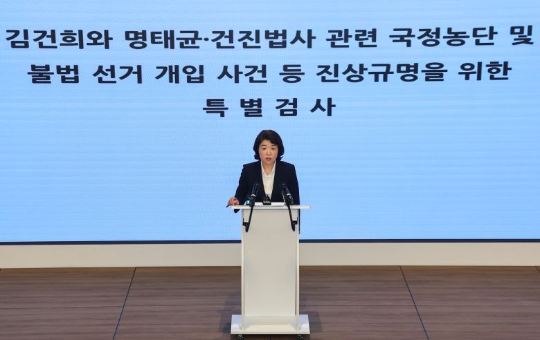 윤석열 전 대통령 부인 김건희 여사와 관련한 각종 의혹 사건을 수사하는 민중기 특별검사팀 오정희 특검보가 지난 8일 서울 종로구 KT광화문빌딩에서 정례 브리핑을 하고 있다. [연합] |