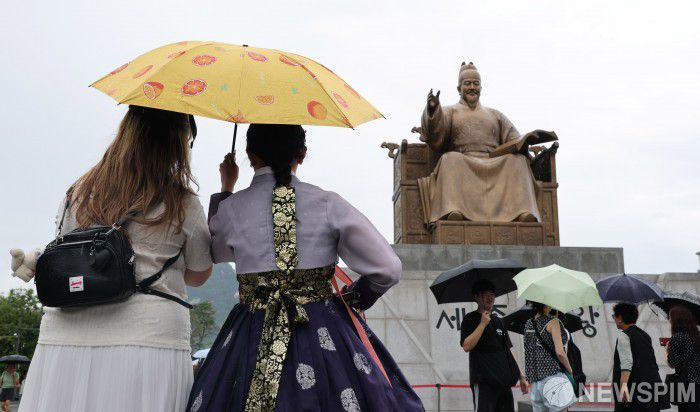 [서울=뉴스핌] 김학선 기자 = 비가 내리면서 2주 넘게 이어지던 폭염이 잠시 주춤해진 14일 서울 광화문광장에서 시민들과 관광객들이 우산을 쓰고 있다. 2025.07.14 yooksa@newspim.com |