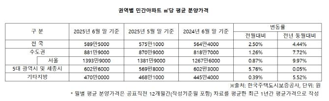 15일 주택도시보증공사(HUG)가 발표한 ‘2025년 6월 말 기준 민간아파트 분양가격 동향’에 따르면 서울에서 최근 1년간 신규 분양된 민간아파트 ㎡당 평균 분양가격은 1393만 9000원으로 집계됐다. 전월 대비 0.87%, 전년 동월 대비 9.97% 상승한 수치다. 분양가를 평(3.3㎡)으로 환산하면 4607만 9000원으로 나타났다.