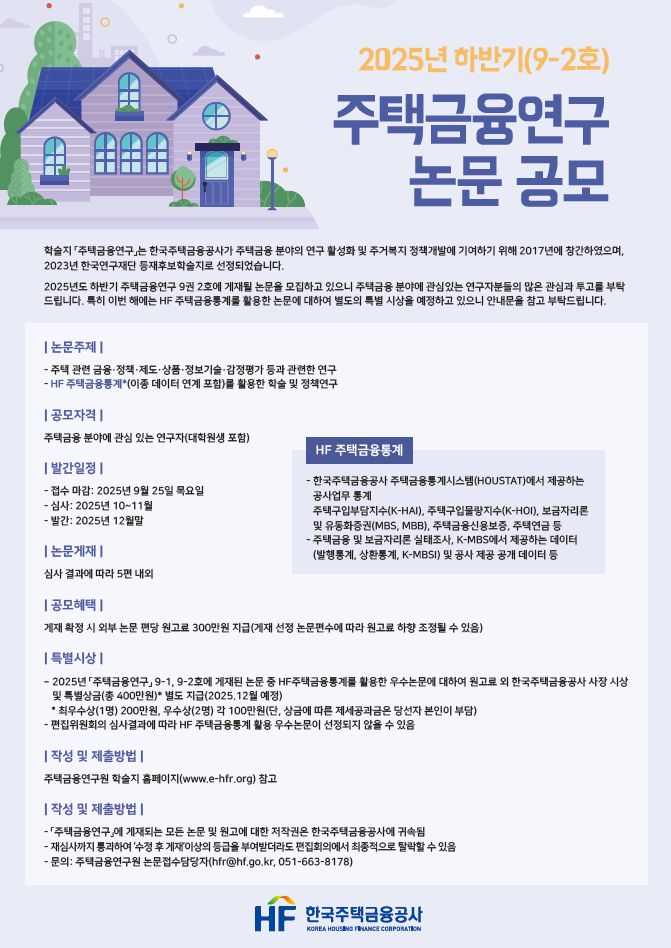 주택금융 등 공사 업무 관련 분야에 관심 있는 연구자(대학원생 포함)라면 누구나 오는 9월 25일까지 주택금융연구 온라인투고시스템을 통해 주택 관련 금융·정책·제도·상품·정보기술·감정평가 등과 관련된 연구 논문을 제출하면 된다.