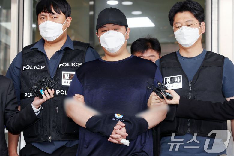 서울 강북구 미아동 마트에서 흉기를 휘둘러 1명을 살해하고 1명을 다치게 한 김성진(32·남)이 1일 오전 서울 강북경찰서에서 검찰로 구속 송치되고 있다. 김 씨는 지난달 22일 오후 6시 20분쯤 서울 강북구 지하철 4호선 미아역 인근 마트에서 흉기로 40대 여성 직원을 다치게 하고 60대 여성 손님을 숨지게 한 혐의를 받는다. 2025.5.1/뉴스1 ⓒ News1 민경석 기자 |