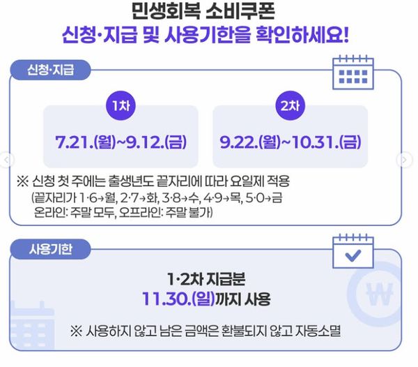원활한 소비쿠폰 지급을 위해 1차 신청 기간인 7월 21일부터 7월 25일까지는 출생년도 끝자리 요일제가 적용된다.