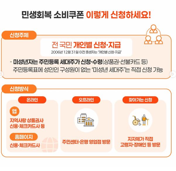 2006년 12월 31일 이전에 출생한 시민은 1차와 2차 각각 신청해야 소비쿠폰을 받을 수 있고 미성년 자녀는 동일 주소지 내 가구주가 신청하면 받을 수 있다.
