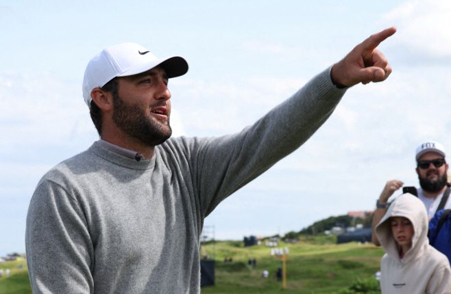 스코티 셰플러가 14일(현지시간) 디 오픈 연습 라운드 도중 어딘가를 가리키고 있다. /로이터 연합뉴스 |