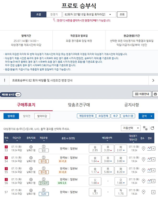 2025 EAFF E-1 챔피언십 남자부, 최종전 대한민국(홈)-일본(원정) 대상 프로토 승부식 82회차 게임 마감 앞둬