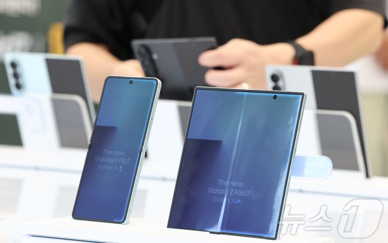 (서울=뉴스1) 김도우 기자 = 삼성전자의 새로운 폴더블폰 갤럭시Z7 시리즈의 예약 판매가 시작된 15일 서울 삼성 강남에서 고객들이 갤럭시Z7 시리즈 제품을 살펴보고 있다. 2025.7.15/뉴스1