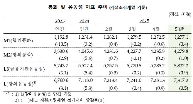 15일 한국은행에 따르면 5월 광의통화 평잔은 4279조8000억원으로 전월 대비 1%(44조원) 증가했다.