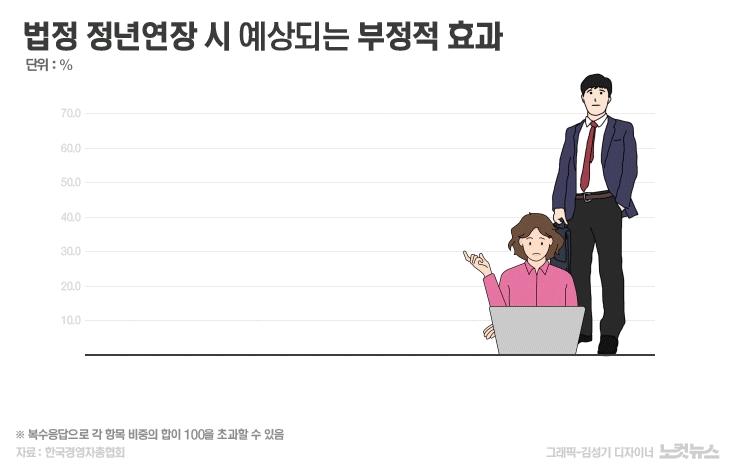 이와 함께 낮은 생산성 대비 높은 비용(43.8%), 세대 갈등 같은 직장문화 저해(23.8%), 노동시장 이중구조 심화(19.5%) 등이 예상되는 부정적 효과로 꼽혔다.