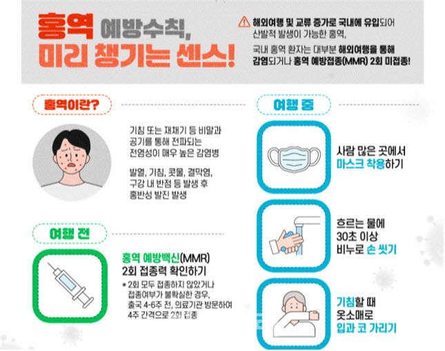 질병청 관계자는 “해외여행 중 마스크 착용 및 개인위생 수칙을 준수해 달라”며 “해외 여행 후 3주 이내 발열, 발진 등 의심 증상이 발생하면 즉시 의료기관을 방문해 해외 여행력을 알리고 의료진 역시 홍역 의심 및 신고에 적극 협조해 달라”고 강조했다.