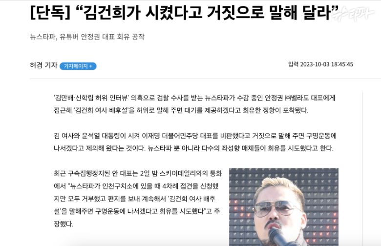 문제의 기사는 2023년 10월 3일에 나왔다. 당시 스카이데일리는 <[단독] “김건희가 시켰다고 거짓으로 말해 달라”>이라는 제목의 기사에서 ▲김만배·신학림 허위 인터뷰’ 의혹으로 검찰 수사를 받는 뉴스타파가 ▲수감 중인 안정권 벨라도 대표에게 접근해 ▲김건희가 시켜서 이재명을 비판한 것처럼 거짓으로 말해달라는 요청을 했다고 보도했다. 이에 대한 대가 지급도 약속했다고 전했다.