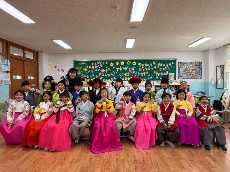 강릉의 한 초등학교에서 진행된 ‘찾아가는 한복문화교육’에서 학생들이 한복을 입은 채 기념 촬영을 하고 있다. 강릉시 제공 |