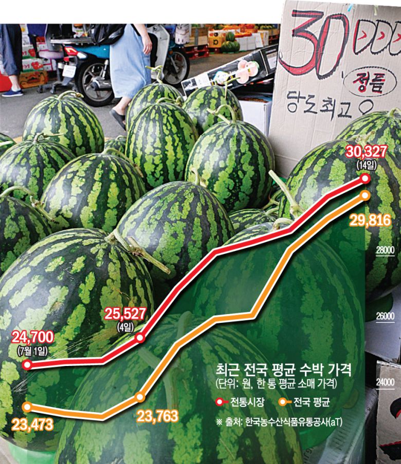 여름철은 연중 가장 높은 농산물 가격을 보이는 것이 일반적이지만 올해는 예년보다 무더위가 일찍 시작되면서 수박, 배추와 같은 일부 농산물의 가격 상승도 빠르게 나타나고 있다.
