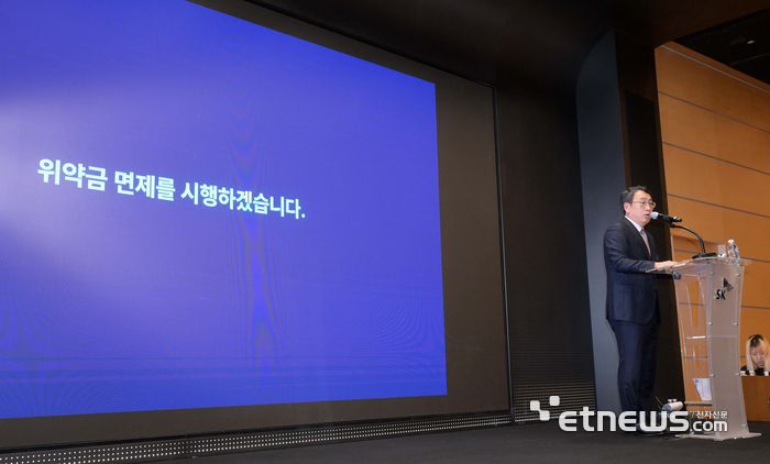 유영상 SK텔레콤 대표가 지난 4일 서울 중구 SKT타워에서 사이버 침해 사고 관련 위약금 면제 계획을 발표하고 있다.