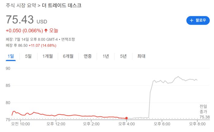 14일(현지시간) 뉴욕증시 시간외거래에서 트레이드 데스크는 한때 정규장 대비 11.07달러(14.68%) 오른 86.50달러에 거래됐다.