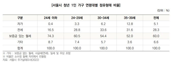 서울시 청년 1인 가구는 단독주택(다가구 포함), 오피스텔 등 비아파트에 주로 거주하고 있다. 단독주택(37.9%) 오피스텔(25.8%) 다세대주택(17.2%) 아파트(11.2%) 등 순이다. 청년 1인 가구의 60%는 보증금이 있는 월세 형태로 살고 있다. 거주 연령이 높아질수록 자가 점유 가구의 비중은 커지는 추세지만, 자가 점유 비율이 기장 높은 35~39세의 청년 1인 가구는 12.8%에 그쳤다.