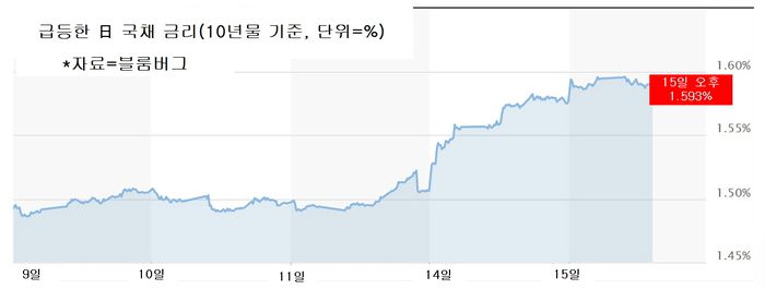 일본 채권시장에서 장기 금리 지표인 10년물 국채 금리도 15일 오전 한때 1.6%까지 치솟았다. 리먼브라더스 사태 직후인 2008년 10월 이후 약 17년 만에 최고 수준이다.