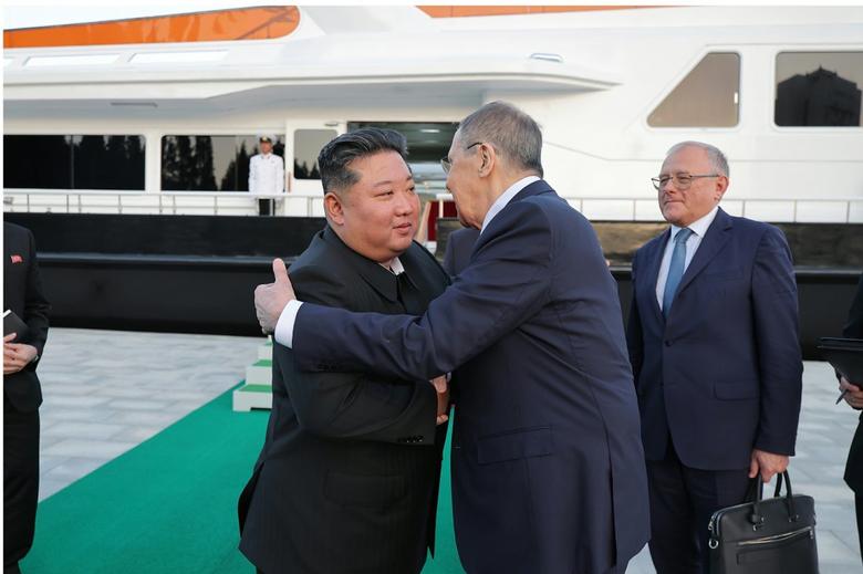 북한 김정은 노동당 총비서가 원산 갈마관광지구에서 세르게이 라브로프 러시아 외무장관과 만나는 모습. (평양 노동신문=뉴스1)