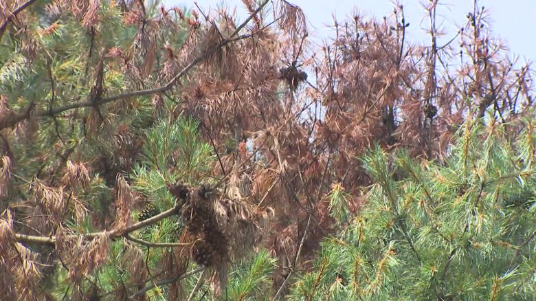아직 여물지 않은 잣이 곳곳에 달렸지만, 재선충병에 걸려 나무가 말라 죽고 있습니다.