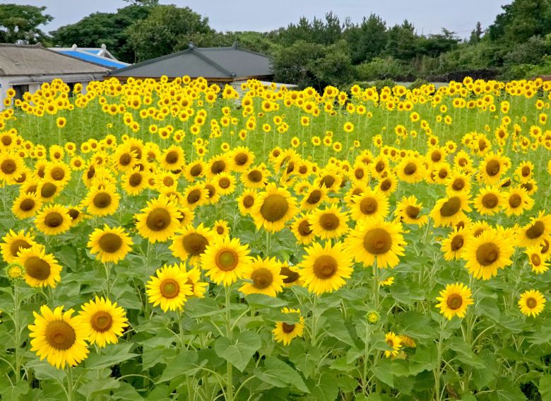 제주 신화월드에서 ‘폭싹 속았수다’ 테마여행온 대만인들의 웃음가득한 표정을 본 뒤, 문화예술촌 저지리로 가는길, 금악 마을에 해바라기가 활짝 피었다.[함영훈 기자] |