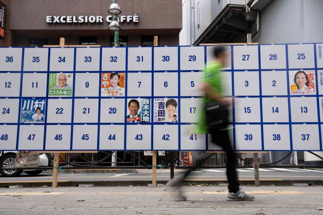 지난 3일 일본 도쿄의 거리에 세워진 참의원 선거 포스터 게시판 앞을 한 시민이 지나가고 있다./AFP 연합 |