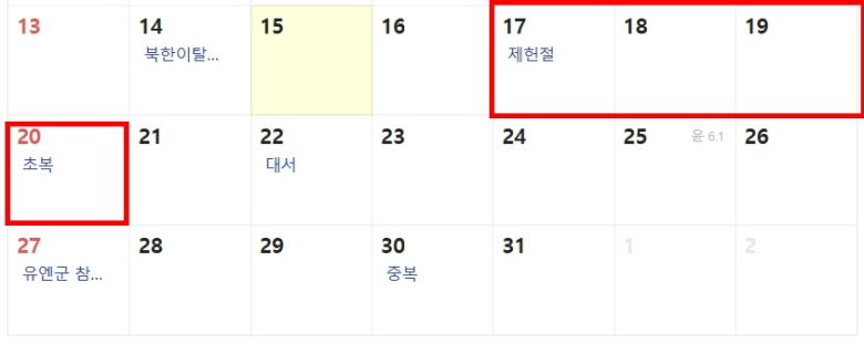 제헌절이 공휴일로 지정되고 내수 촉진을 위해 18일 금요일이 임시공휴일로 지정된다면 총 4일의 연휴가 생긴다. 사진=네이버 달력 갈무리 |
