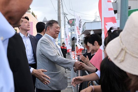오는 20일 치러지는 참의원 선거 지원에 나선 이시바 총리가 지난 14일 아오모리현을 방문해 유권자들과 악수를 나누고 있다. 출처 이시바 시게루 총리 X |