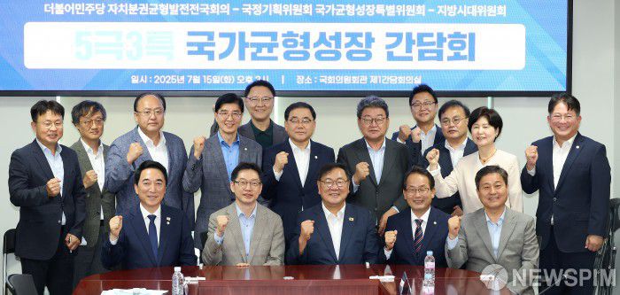 [서울=뉴스핌] 정일구 기자 = 박수현 국정기획위원회 국가균형성장특별위원회 위원장, 김경수 지방시대위원회 위원장, 김태년 자치분권균형발전전국회의 상임대표 등이 15일 오후 서울 여의도 국회 의원회관에서 열린 더불어민주당 자치분권균형발전전국회의-국정기획위원회 국가균형성장특별위원회-지방시대위원회 '5극3특 국가균형성장 간담회'에서 참석자들과 기념촬영을 하고 있다. 2025.07.15 mironj19@newspim.com