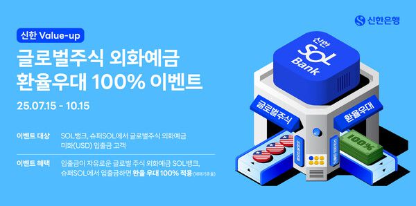 신한은행은 7월 15일부터 10월 15일까지 '글로벌주식 외화예금 환율 100% 우대' 이벤트를 진행하고 '신한 Value-up 글로벌주식 외화예금'을 이용해 글로벌 투자를 하는 고객에게 추가 혜택을 제공한다.