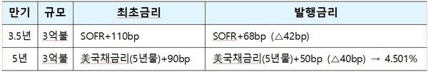 이번 글로벌채권은 3.5년 만기 3억 달러, 5년 만기 3억 달러로 구성된 듀얼 트랜치(Dual-Tranche) 구조로 발행되었으며, 3.5년 만기(변동) 금리는 SOFR+68p, 5년 만기(고정) 금리는 동일 만기 미국채 금리에 50bp를 가산한 4.501%로 확정됐다.