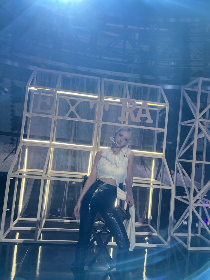 전소미는 화이트 러플 탑과 블랙 글로시 팬츠로 완벽한 무대 의상을 소화하며, 특유의 카리스마와 세련미를 뽐냈다.