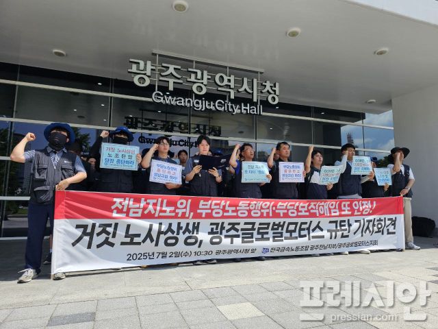 ▲전국금속노동조합 광주전님지부와 광주글로벌모터스지회가 2일 광주광역시청 앞에서 '거짓 노사상생, 광주글로벌모터스 규탄 기자회견'을 열고있다.2025.07.02ⓒ금속노조 광주전남지부 |