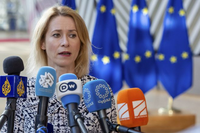 15일(현지시간) 유럽연합 외교장관 회의 참석을 위해 브뤼셀 EU 이사회 건물에 도착한 카야 칼라스 EU 외교·안보 정책 고위대표가 기자들과 대화하고 있다. /AP·연합