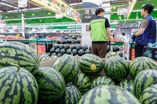 이달 초부터 시작된 때 이른 무더위로 농산물값이 오르는 '히트플레이션' 현상이 나타나며 최근 일주일 새 수박 한 통이 3만원을 넘어서고, 특히 배추나 시금치 같은 더위에 약한 채소 가격이 상승한 가운데 14일 서울 서초구 하나로마트 양재점에 수박이 진열돼 있다. 2025.7.14. 강진형 기자 |