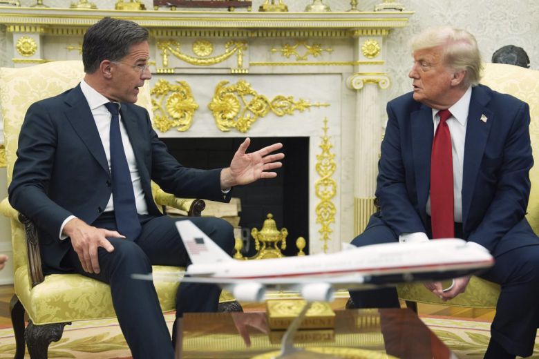 도널드 트럼프(오른쪽) 미국 대통령이 14일(현지시각) 백악관 집무실에서 마르크 뤼테 북대서양조약기구(NATO) 사무총장과 회담하고 있다. 트럼프 대통령은 “러-우 전쟁은 트럼프의 전쟁이 아니라 바이든, 민주당의 전쟁”이라며 우크라이나 평화 협정 이외에는 미국이 직접적 책임을 질 생각이 없음을 분명히 했다. 2025.7.15. 워싱턴=AP/뉴시스