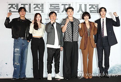 (서울=연합뉴스) 이재희 기자 = 15일 서울 강남구 메가박스 코엑스점에서 열린 영화 '전지적 독자 시점' 시사 간담회에서 배우 이민호(왼쪽부터), 채수빈, 김병우 감독, 배우 신승호, 나나, 안효섭이 포즈를 취하고 있다. 2025.7.15