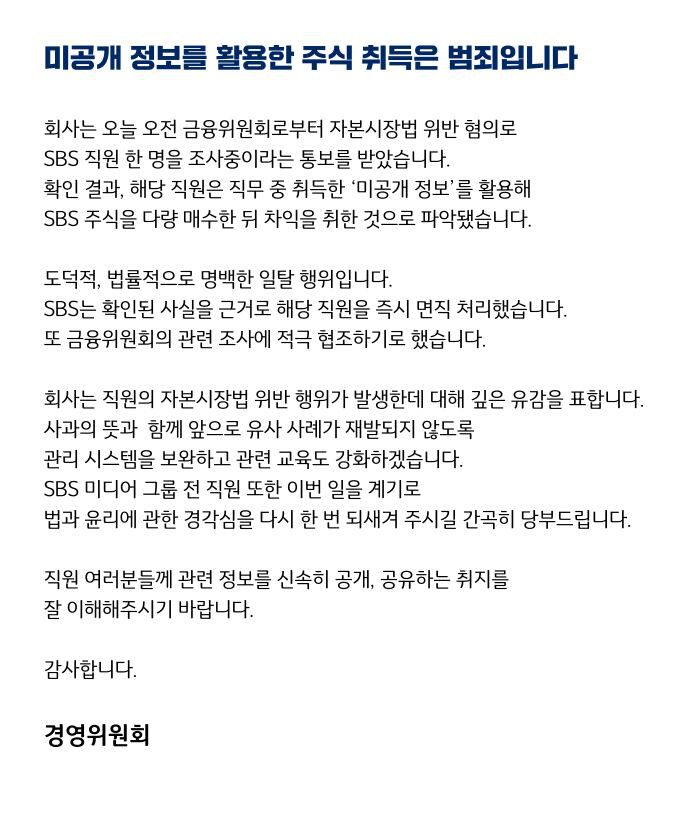 직원의 미공개 이용 정보 관련 SBS의 입장문./SBS |