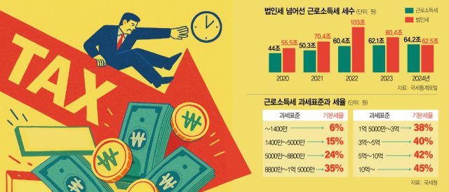 이처럼 매년 그림자 증세가 반복되면서 정부가 월급쟁이들로부터 거둬들이는 세금은 매년 급증하고 있다. 지난해에는 근로소득세 비중이 법인세 비중을 앞지르기도 했다. 국세통계포털에 따르면 지난해 근로소득세 세수는 64조 1580억 원으로 전년(62조 700억 원) 대비 3.4% 늘었다. 총국세 336조 5000억 원 가운데 근로소득세가 차지하는 비중은 19.1%에 달했다. 반면 기업 경영 악화에 따라 지난해 걷힌 법인 세수는 62조 5100억 원에 그쳐 전년(80조 4100억 원) 대비 22.3% 감소했다. 총국세 대비 비중도 18.6%에 머물렀다.