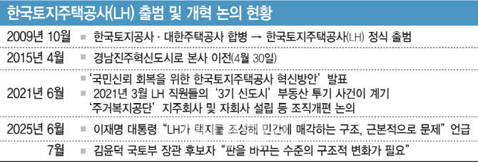 [이데일리 최정희 이다원 기자] 한국토지주택공사(LH)에 대한 구조 개혁이 이재명 정부의 최대 과제로 떠오르고 있다. 김윤덕 국토교통부 장관 후보자는 이재명 대통령의 주문으로 가장 먼저 ‘LH 개혁’을 꼽았다. 이 대통령은 지난달 LH가 택지를 조성해 민간에 매각하는 행위에 대해 “근본적 문제가 있다”고 지적했다.
