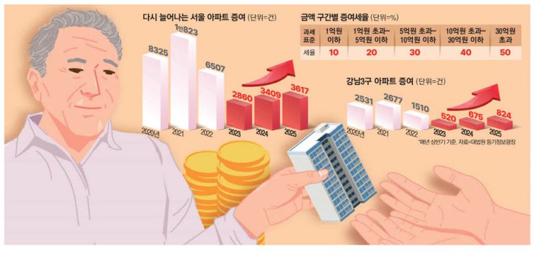 최근 2~3년간 아파트 증여 움직임은 잠잠했다. 2020년 문재인 정부 당시 종합부동산세 등 부담 때문에 2만2772건까지 치솟았던 서울 집합건물(아파트·오피스텔 등) 증여는 2023년에는 6011건까지 줄어들었다. 집값이 안정세를 보인 데다 정부 정책도 큰 변화가 없어 자산가들 입장에서는 증여를 선택할 이유가 없었기 때문이다.